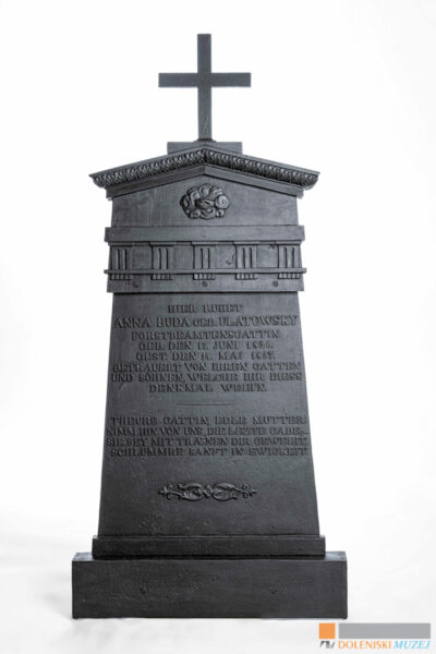 Naslov: Nagrobna plošča Anne Buda, rojene Ulatowsky. Inventarna številka: KZ 232 Avtor/izdelovalec: Železarna Dvor Datacija: druga polovica 19. stoletja Material: lito železo Mere: 160 x 74,5 Provenienca: Dvor Fotograf: Borut Peterlin