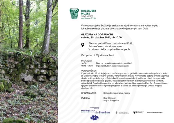 OBRAZLOŽITEV: V prvi polovici 19. stoletja je ob vznožju z gozdom bogatih Gorjancev delovala glažuta, v kateri so izdelovali razne steklene izdelke. V Dolenjskem muzeju Novo mesto poteka projekt Doživetje stekla, v sklopu katerega bi želeli obuditi spomin na nekdanji steklarski obrat. Na sprehodu bomo spoznali delovanje glažute, ostanke njenih objektov in ostale zanimivosti o lastnikih, delavcih itd. Sprehod bo potekal ob slikovitem hudourniškem potoku Klamfer. Spoznali bomo njegove značilnosti in si ogledali pregrado, s katero se želi ob povodnjih ukrotiti njegovo silovito moč.